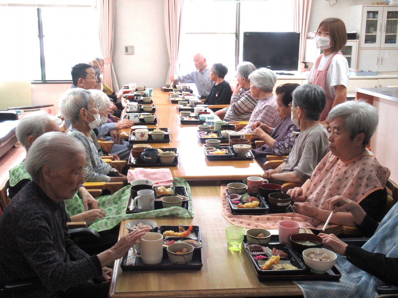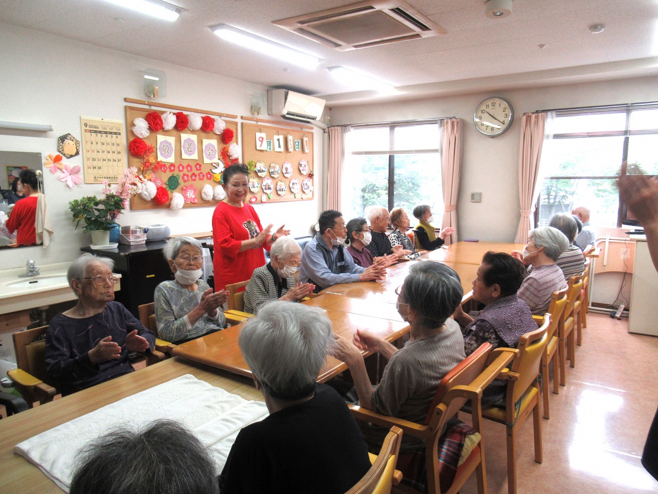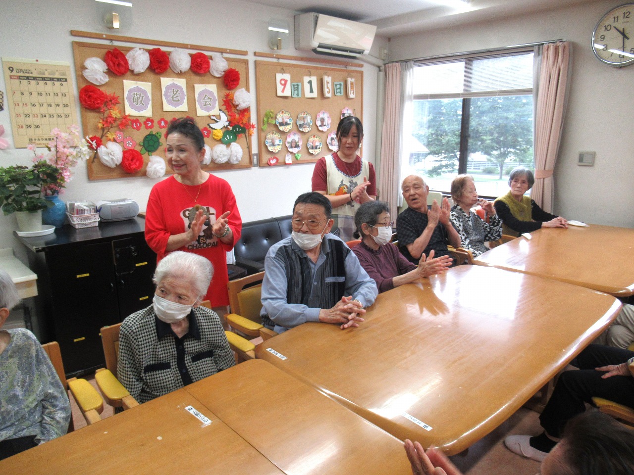 9月は敬老会を行い、都道府県の名産ゲームをしたり、皆様でカラオケをして楽しみました♪昼食には豪華なお刺身、天ぷらの手作り弁当を美味しく召し上がっております。